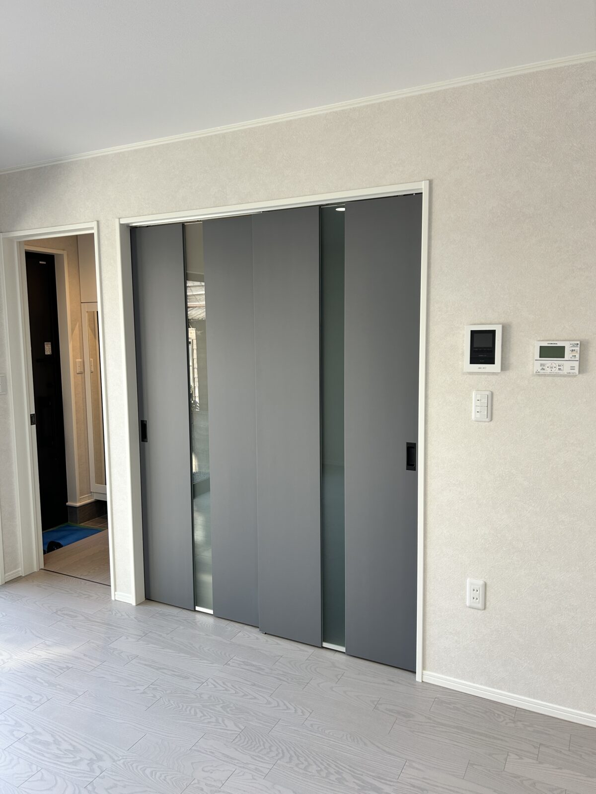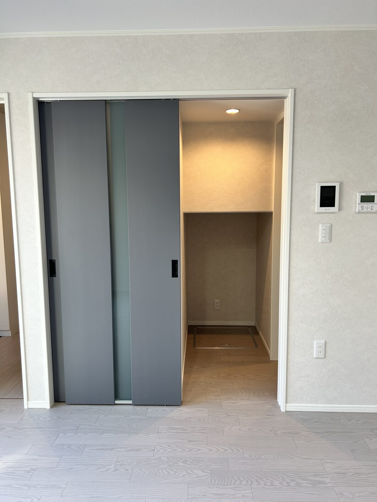 限られた床面積の中、階段前に扉が欲しいというご要望に対して引き違い戸を活用したご提案をさせていただきました。